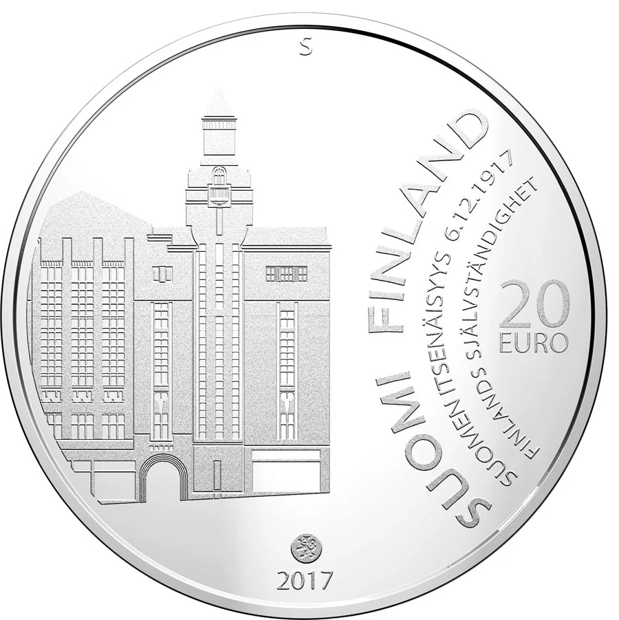 A photo of Helsinki's former art nouveau Heimola Building at Kluuvikatu 5. Top: engraver's initial (S). Bottom: Mint of Finland mark.