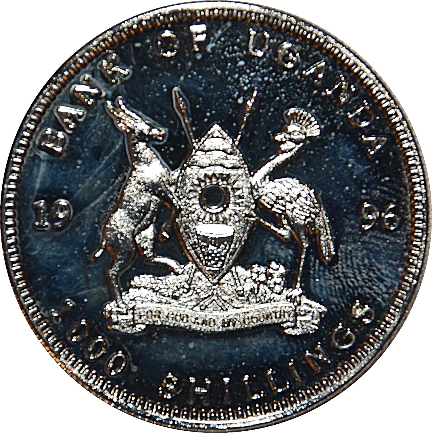 Ugandan coat of arms on a toothed rim.