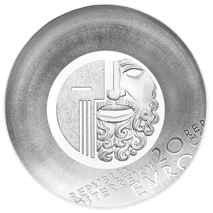 Two masks inside represent drama's basic forms: tragedy (left) and comedy (right).