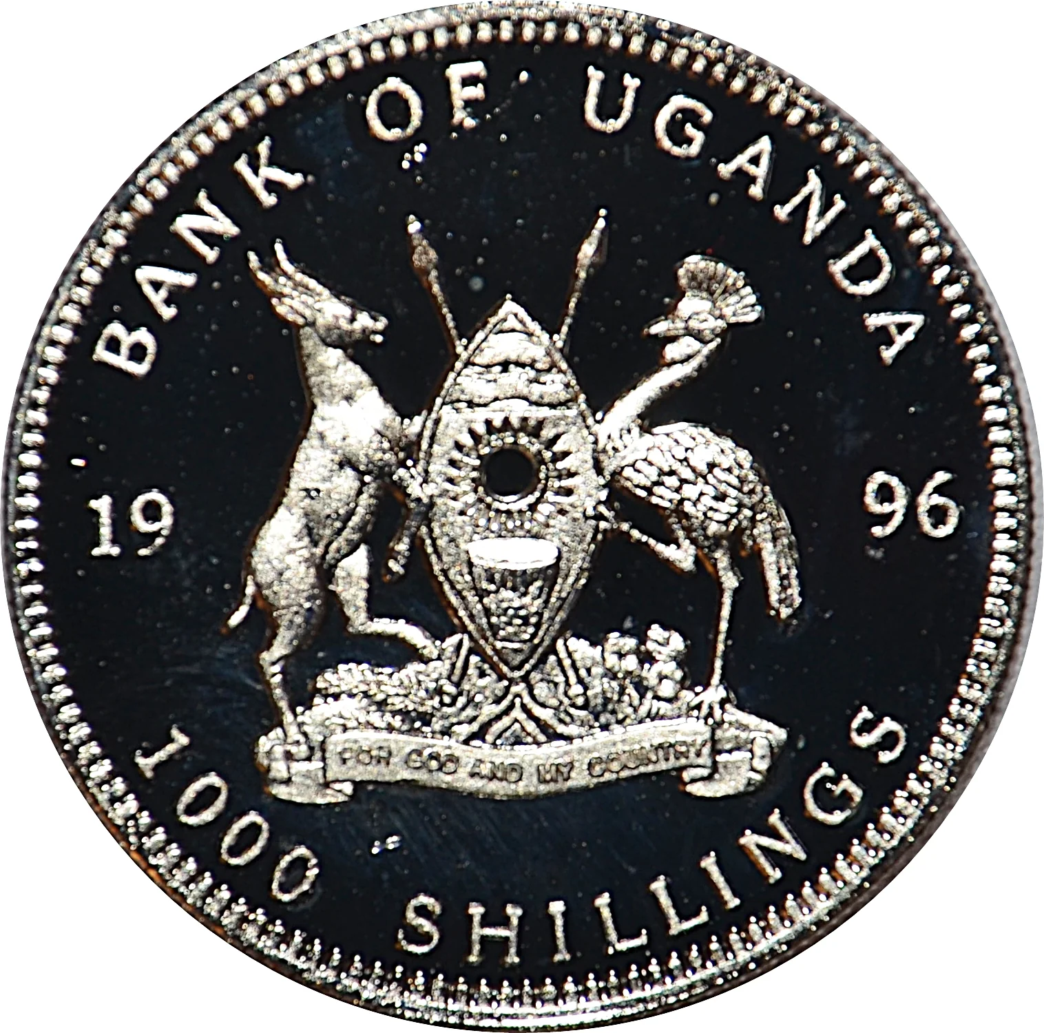 Ugandan coat of arms on a toothed rim.