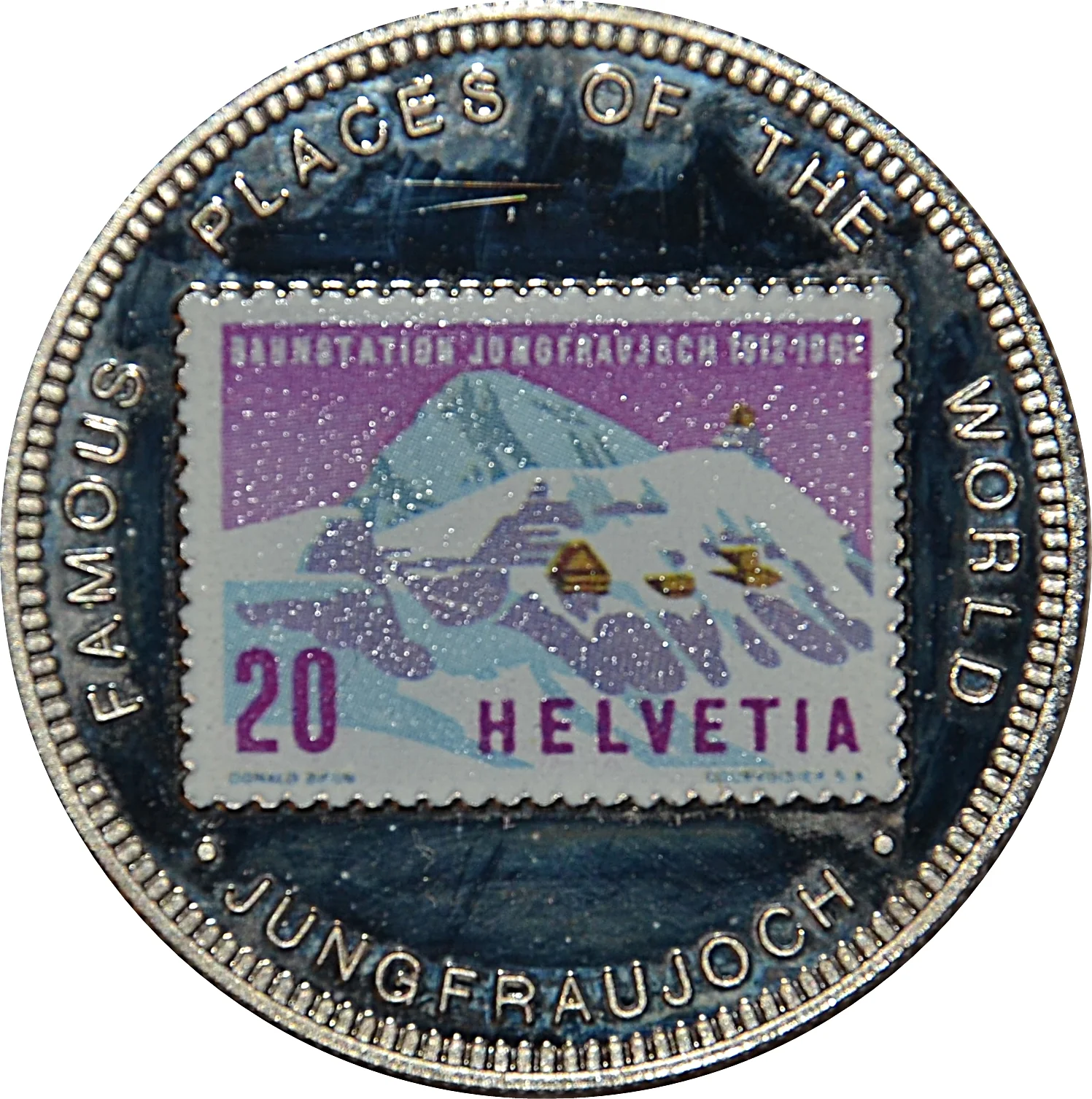 Colored 20-rappen Swiss stamp of Jungfraujoch with toothed rim.