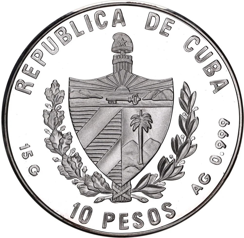 Cuban coat of arms with curved country name above, face value below, and weight and fineness on the sides.