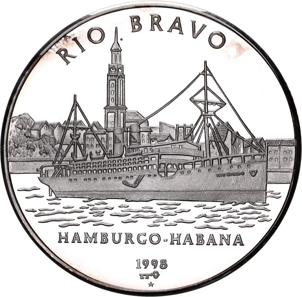 Rio Bravo ship with port background, curved vessel name above, service line below, date and mintmark in exergue.