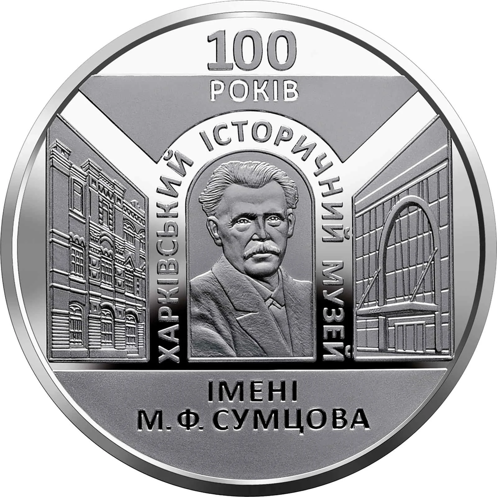 Description: A stylized composition shows the museum's different-period facades flanking a central arch with a portrait of Mykola Sumtsov. Legends: "100/РОКІВ" above, "ХАРКІВСЬКИЙ ІСТОРИЧНИЙ МУЗЕЙ" arched over the portrait, and "ІМЕНІ/ М. Ф. СУМЦОВА" below on a matt background.