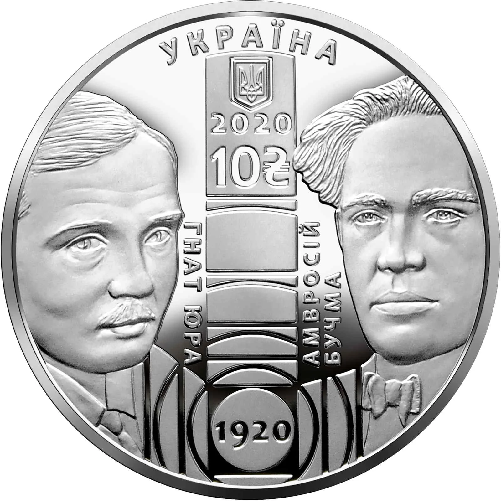 The coin features Ukraine's small coat of arms with "УКРАЇНА" above and "2020 10 ₴" below. On the left is a portrait of Hnat Yura with his name vertically to its right; on the right is Amvrosii Buchma with his name vertically to its left. Below them is "1920," the founding year of the theater they helped establish.