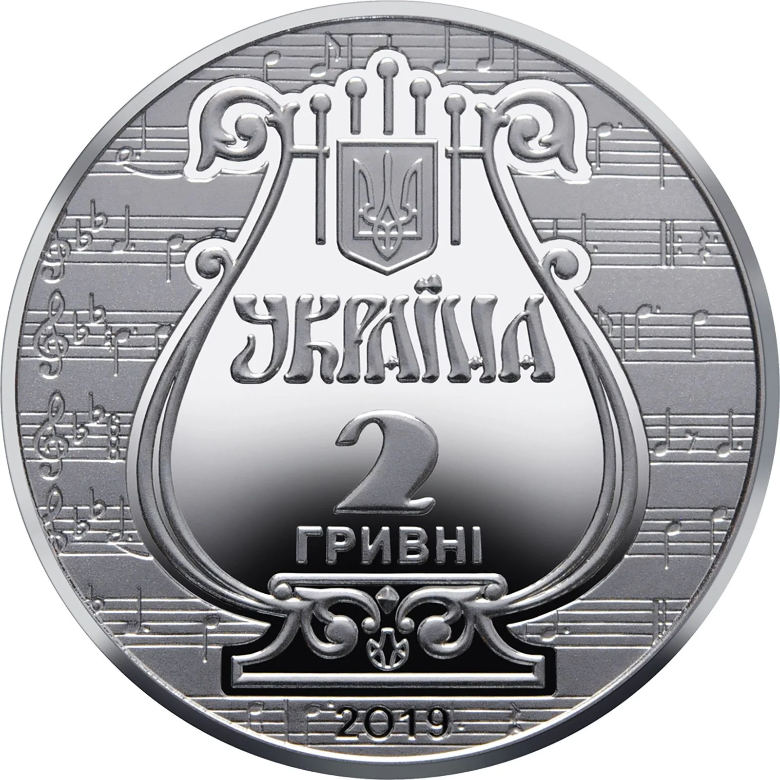 Against a music sheet background, a lyre appears below Ukraine's small coat of arms and the inscriptions "УКРАЇНА/2/ГРИВНІ." At the bottom are the mint mark and the year 2019.