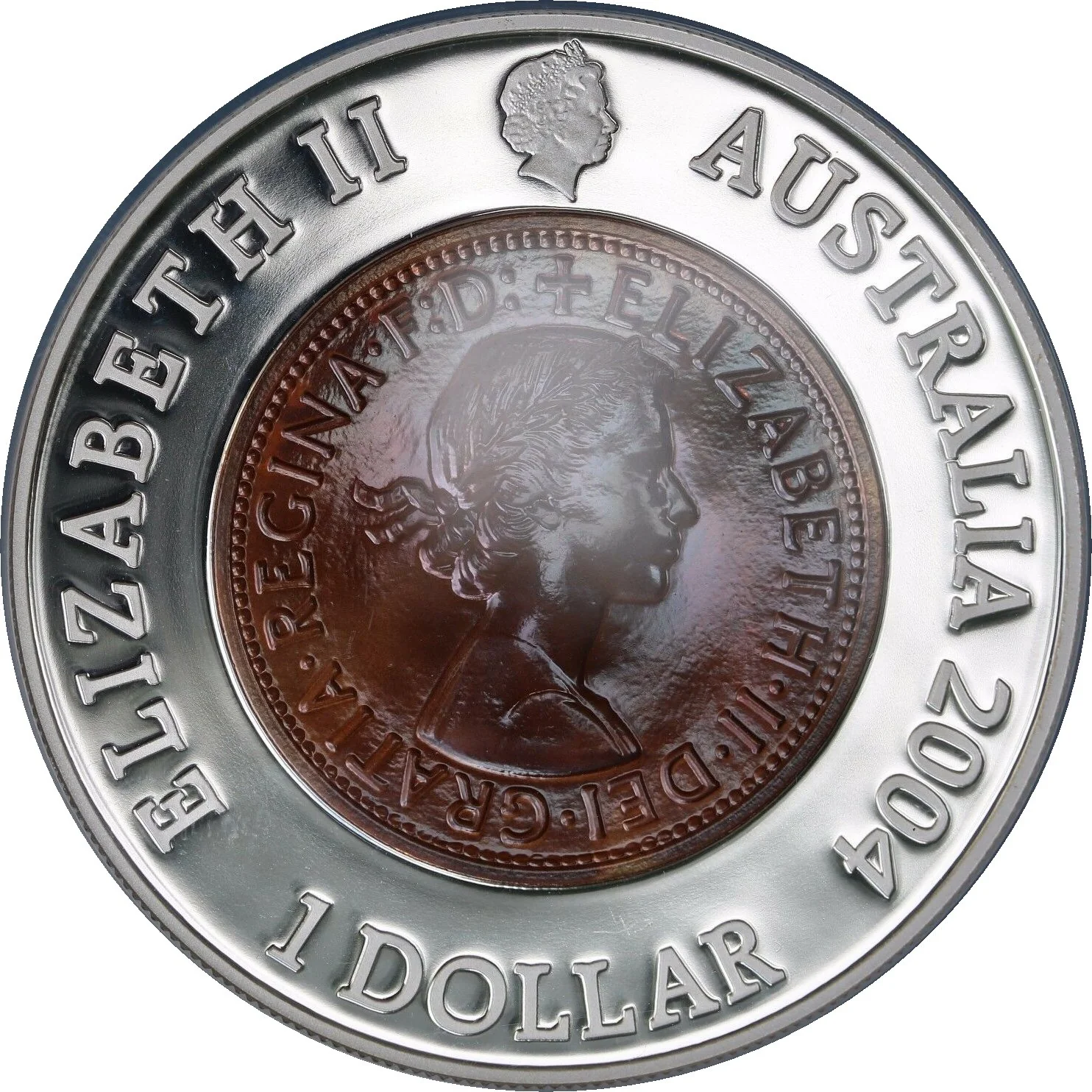 A miniature fourth portrait of Queen Elizabeth II facing right, wearing the Girls of Great Britain and Ireland Tiara, overlaid on her first portrait from the Australian penny (1953-1964).