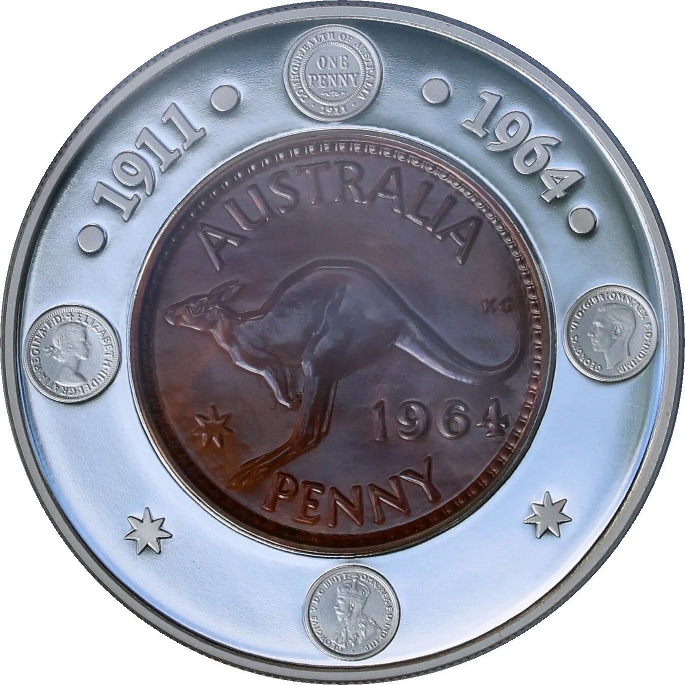 A 1964 Australian Penny reverse set within a silver ring featuring penny obverses and reverses from 1911 to 1964.