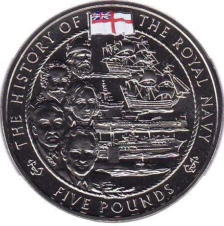 Right side portraits: Alfred the Great, Sir Francis Drake, Horatio Nelson, Jackie Fisher, and Sandy Woodward. Various period warships. Navy flag above.