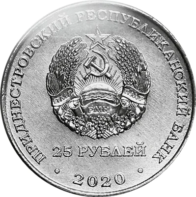 State Emblem of Transnistria. Circular inscription: top - "ПРИДНЕСТРОВСКИЙ РЕСПУБЛИКАНСКИЙ БАНК" (Transdniestrian Republican Bank), bottom - "25 РУБЛЕЙ" (25 Roubles). Below the emblem, the year "2020".