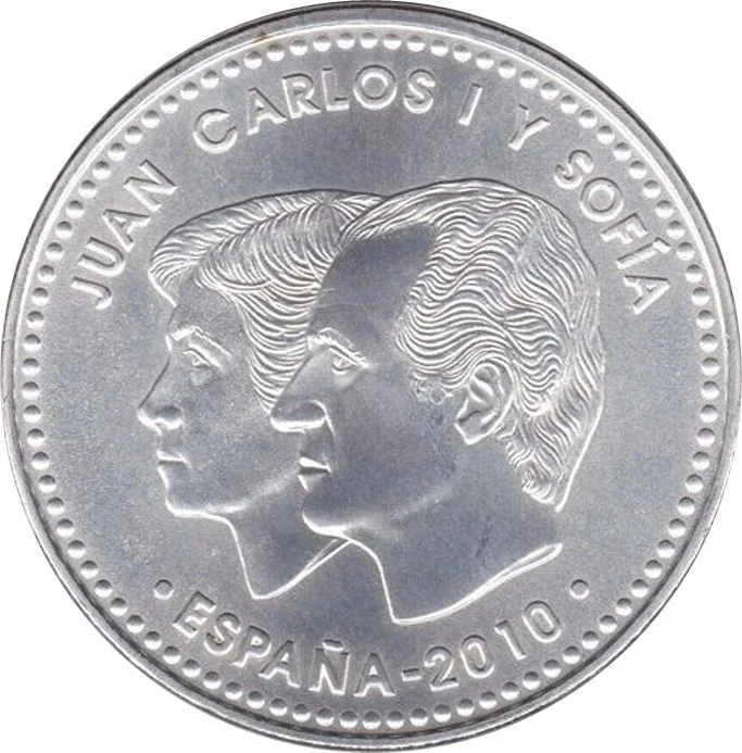 Conjoined heads of King Juan Carlos I and Queen Sofía, facing left.