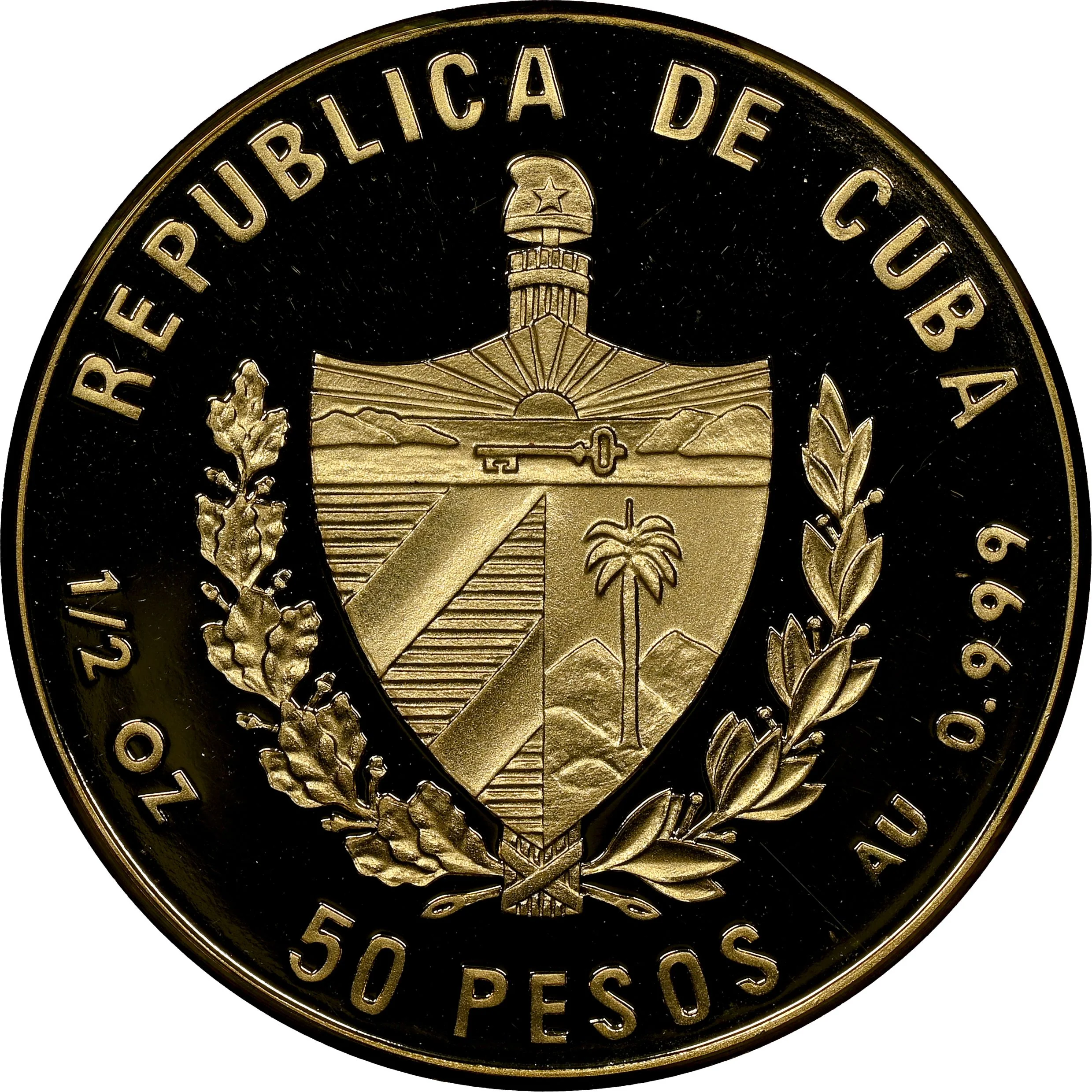 Cuban coat of arms with curved country name above, weight and fineness on the sides, and face value below.