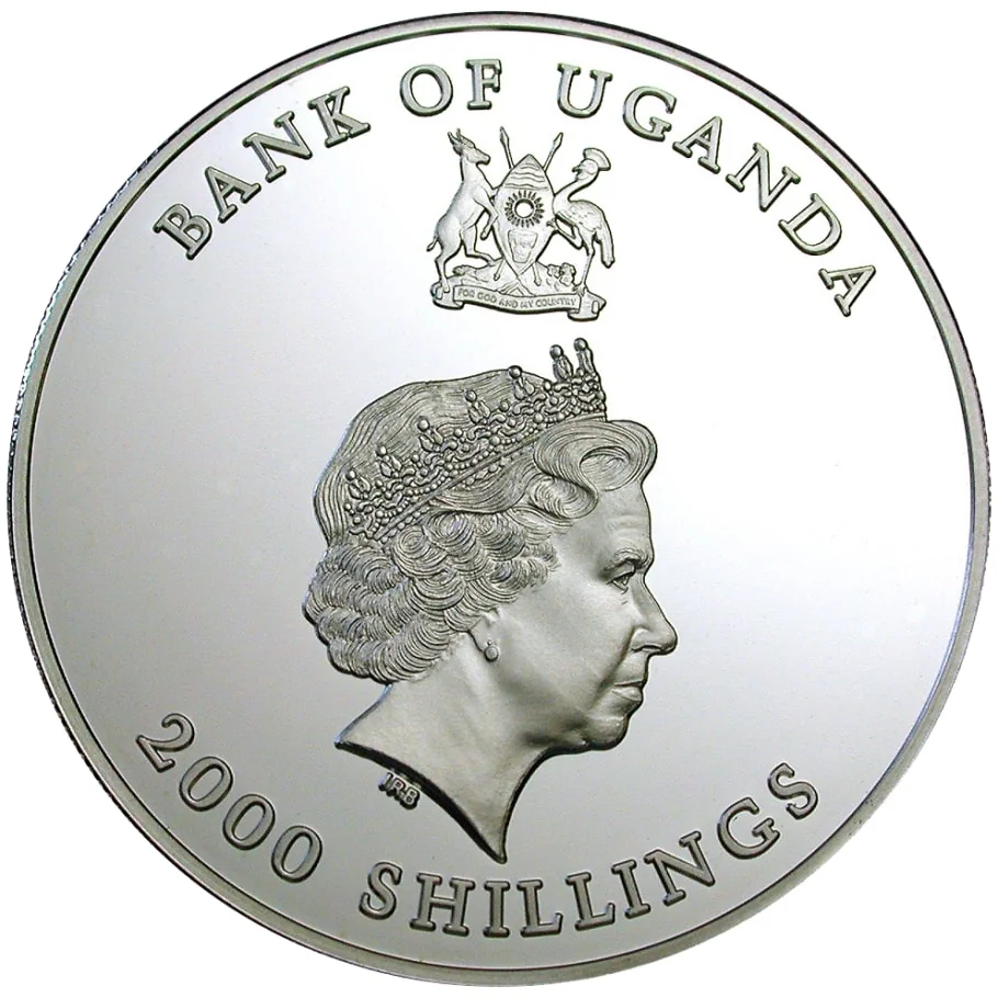 Queen Elizabeth II facing right. Ugandan coat of arms above.