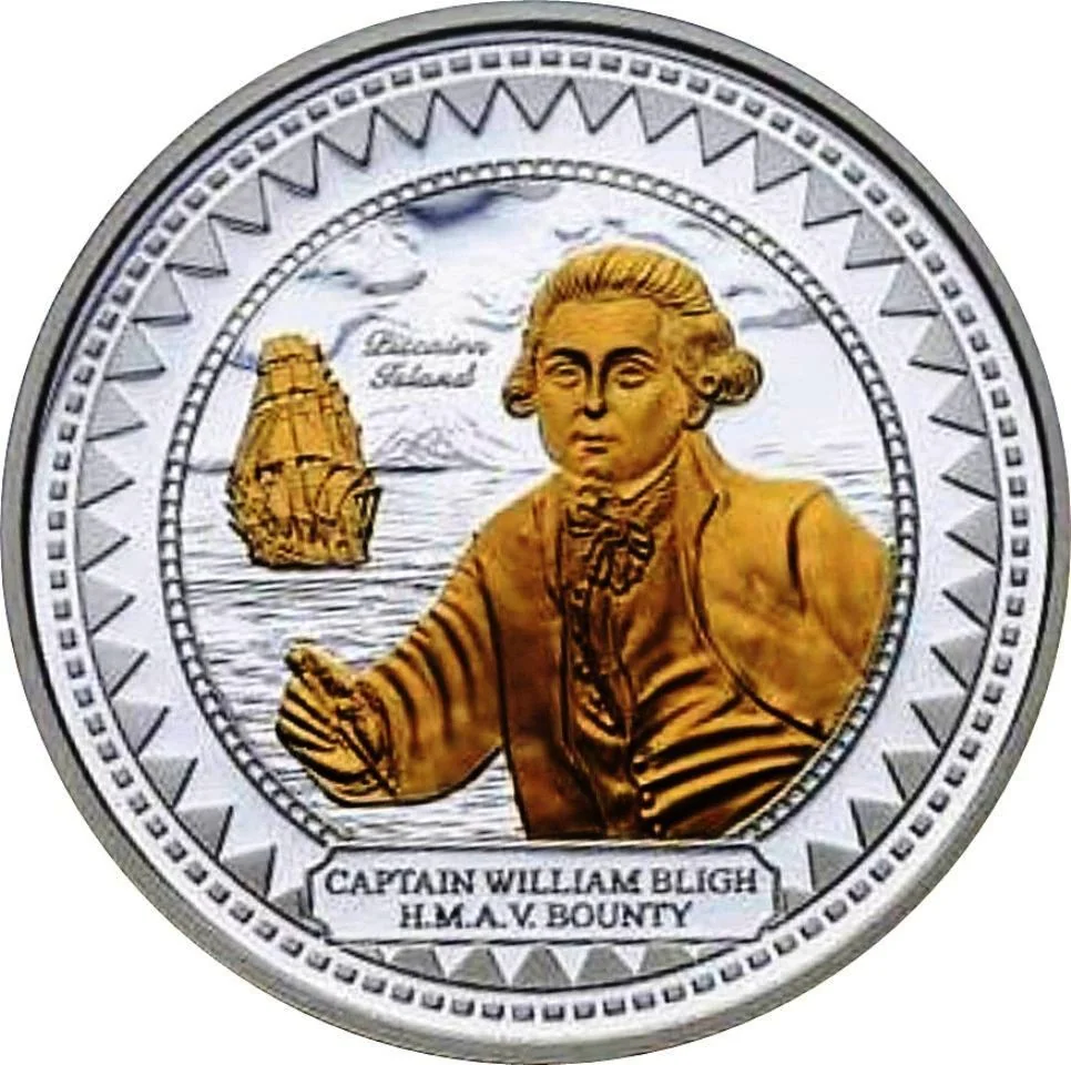 Gilded portrait of Captain Bligh with the HMVA Bounty behind him.