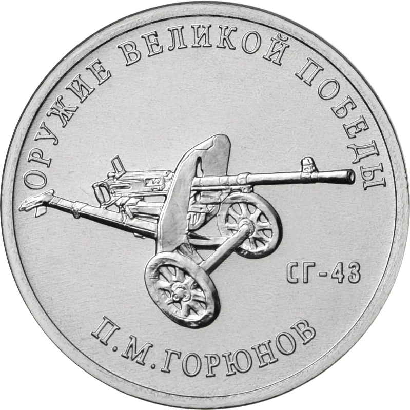SG-43 machine gun relief with its designation; circumferential text reads "Weapons of the Great Victory" above and "Pyotr Goryunov" below.