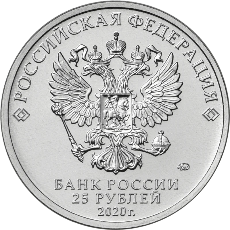 The obverse features the Russian national emblem, with "РОССИЙСКАЯ ФЕДЕРАЦИЯ" above, framed by diamonds. Below are "БАНК РОССИИ", the denomination "25 РУБЛЕЙ", the year "2020 г.", and the Moscow mint mark.