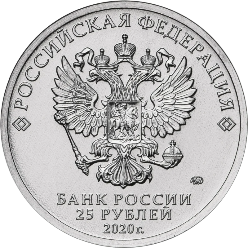 The obverse features the Russian national emblem, with "РОССИЙСКАЯ ФЕДЕРАЦИЯ" above, framed by diamonds. Below are "БАНК РОССИИ", the denomination "25 РУБЛЕЙ", the year "2020 г.", and the Moscow mint mark.