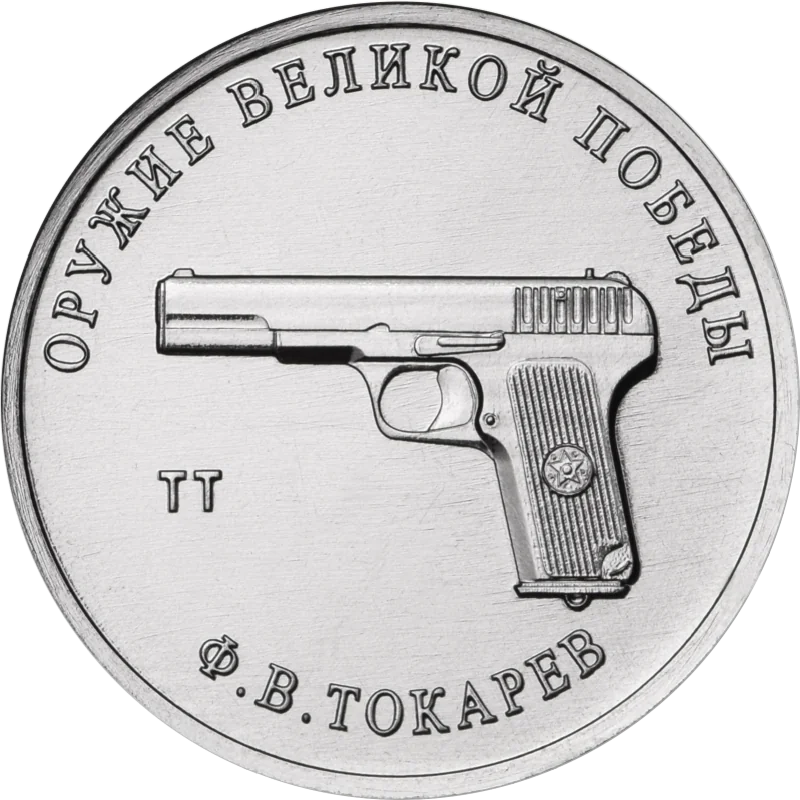 A TT pistol relief with "TT" at bottom left; around the edge, "ОРУЖИЕ ВЕЛИКОЙ ПОБЕДЫ" (Weapons of the Great Victory) on top and "Ф.В. ТОКАРЕВ" (Fyodor Tokarev) below.