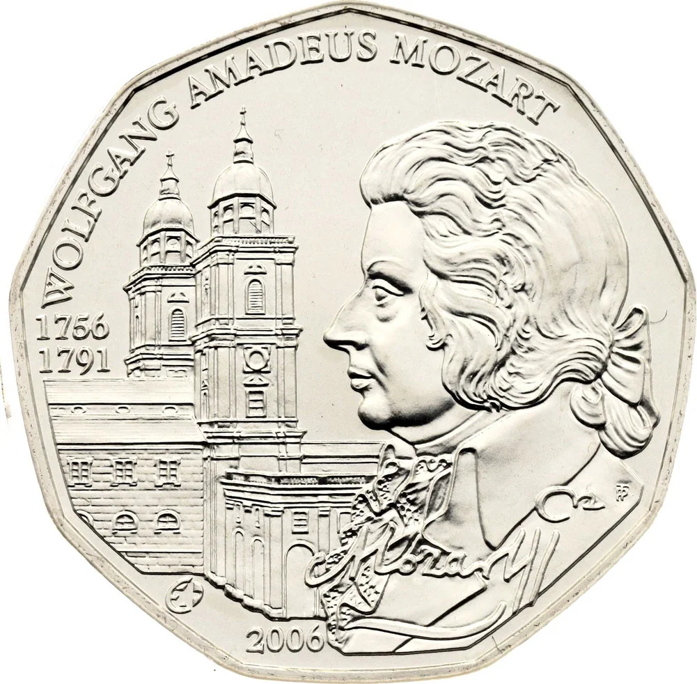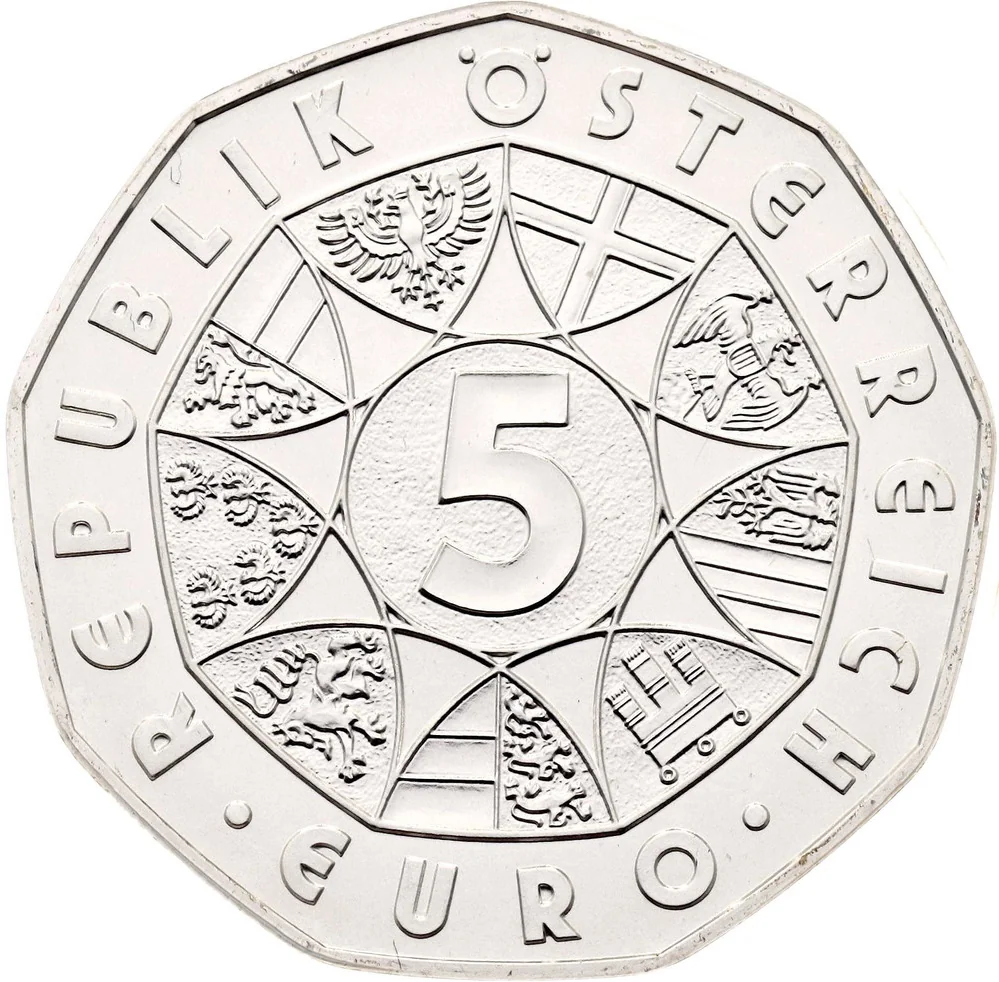 The design, inspired by Austria's old 50 schilling coins, features the "5 EURO" value encircled by the nine provincial coats of arms and the inscription "REPUBLIK ÖSTERREICH."