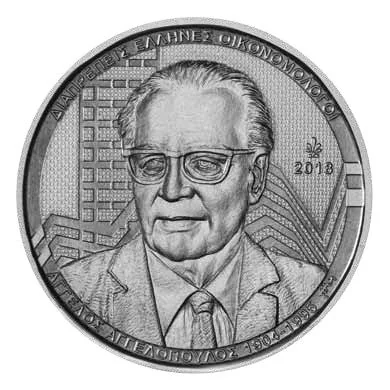 Portrait of Greek economist Angelos Angelopoulos (1904-1995), with the mint mark and issue year, surrounded by lettering.