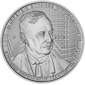 Portrait of Greek economist Kyriakos Varvaressos (1884-1957) with mint mark and issue year, surrounded by lettering.