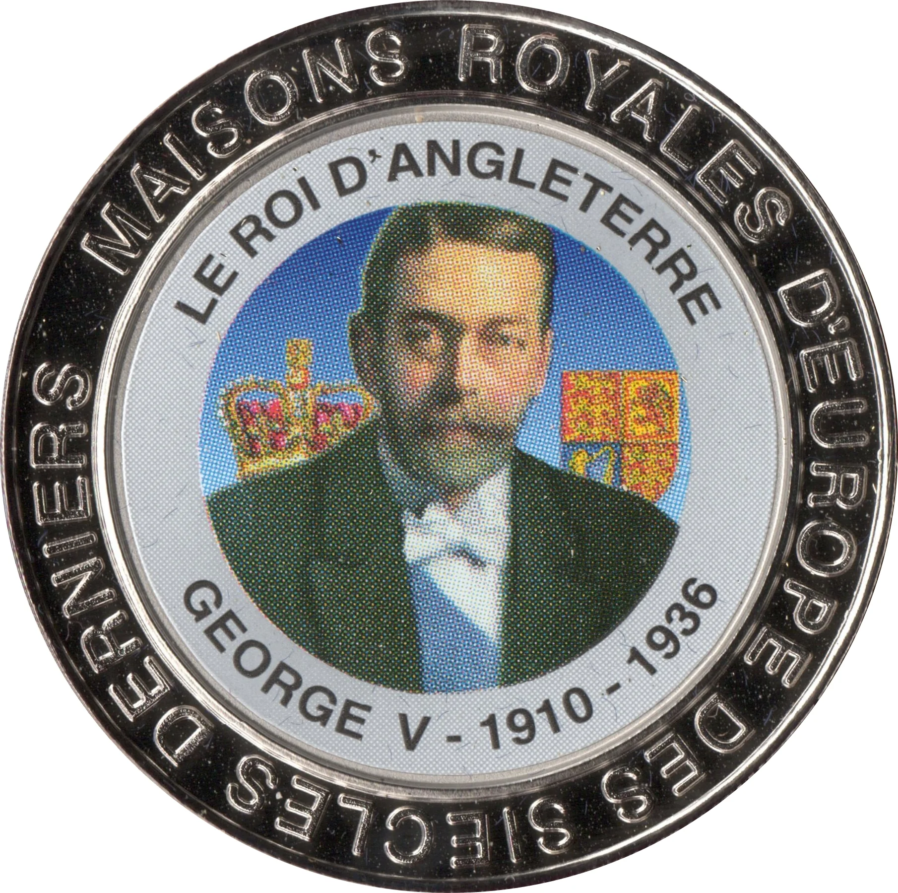 Multicolor portrait of King George V inside a circle.