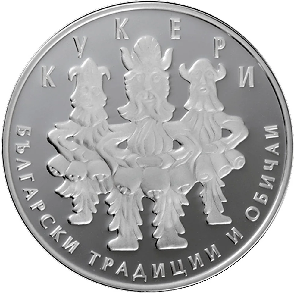 The reverse depicts three kukeri, with the inscriptions "КУКЕРИ" above and "БЪЛГАРСКИ ТРАДИЦИИ И ОБИЧАИ" below.