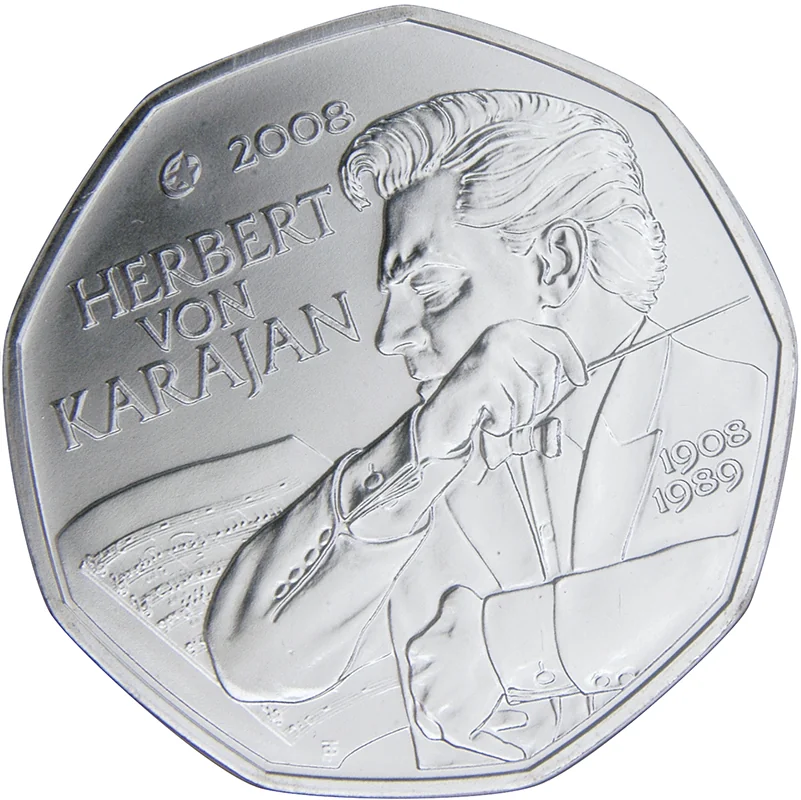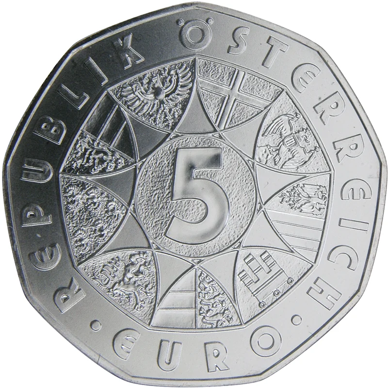 The design, inspired by Austria's old 50 schilling coins, features the "5 EURO" value encircled by the nine provincial coats of arms and the inscription "REPUBLIK ÖSTERREICH."