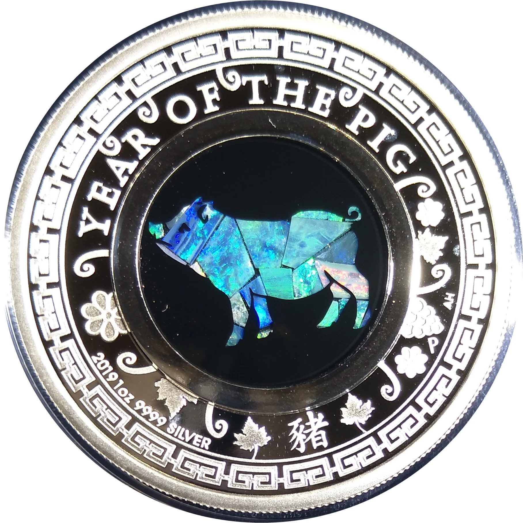 Featuring an inner panel of a pig in Australian opal, surrounded by stylised foliage, grapes, and flowers. The design includes the inscriptions YEAR OF THE PIG, 2019, and the Perth Mint 'P' mintmark.