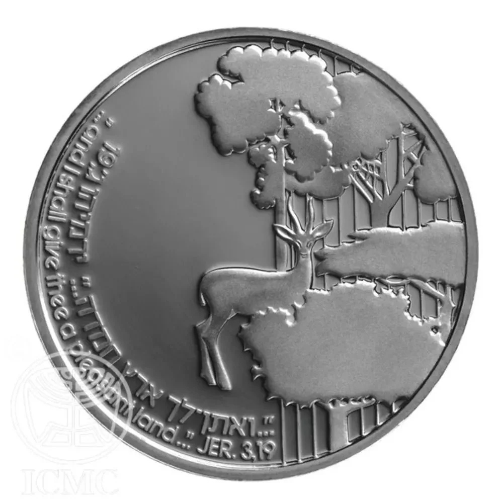Stylized trees and gazelle, symbolizing Israel's flora and fauna. The border includes the verse "...and I shall give thee a pleasant land... Jer. 3:19" in Hebrew and English.