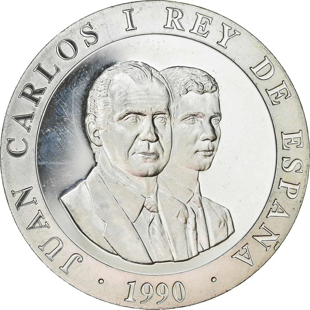 Conjoined busts of Juan Carlos I and Felipe facing right.