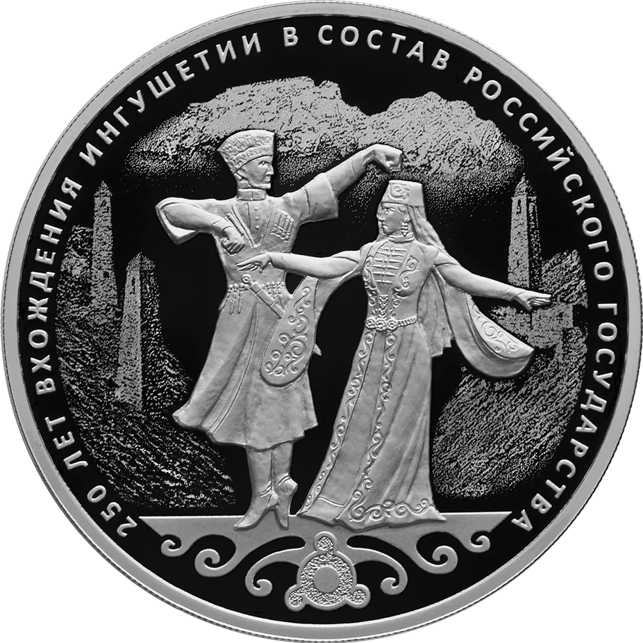 The reverse depicts stylized male and female silhouettes in national costume, ancient Ingush towers and mountains with a laser-matte finish, traditional ornaments below, and a circumferential inscription: "250 ЛЕТ ВХОЖДЕНИЯ ИНГУШЕТИИ В СОСТАВ РОССИЙСКОГО ГОСУДАРСТВА."
