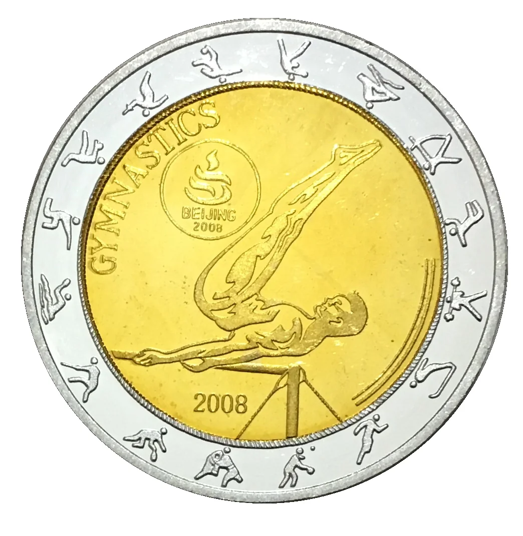 Gymnast with Beijing 2008 Olympic emblem above, date below.