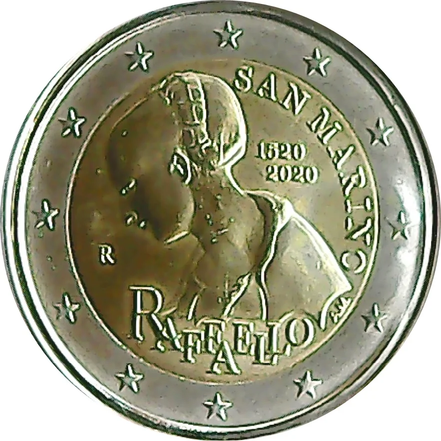 Description: This design reproduces the Virgin Mary from Raphael's early fresco, *Madonna di Casa Santi*, located in Urbino. The coin features the issuing country 'SAN MARINO', the years '1520' and '2020', the inscription 'RAFFAELLO', the designer's initials 'AM', and the Rome Mint mark 'R'. The outer ring depicts the 12 stars of the European flag.