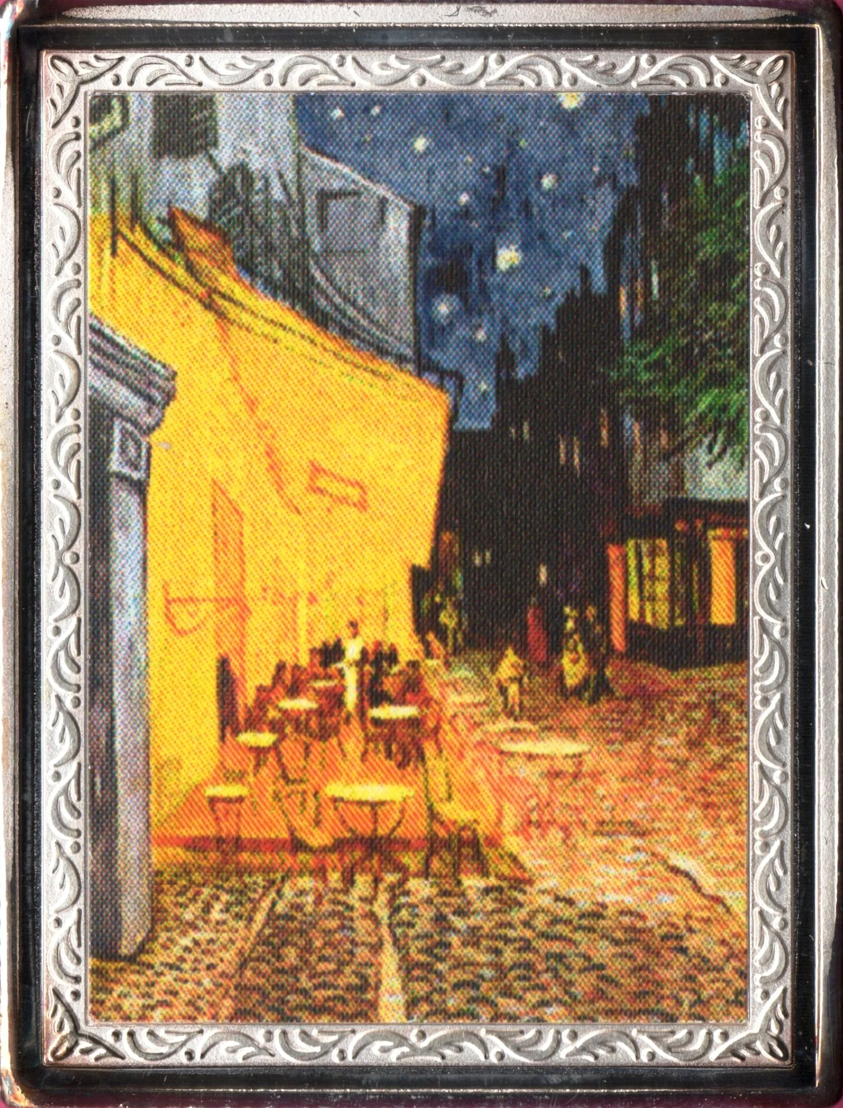 Van Gogh's "Terrace at Night," depicting the lit café terrace on Arles's Place du Forum, in a decorated frame.
