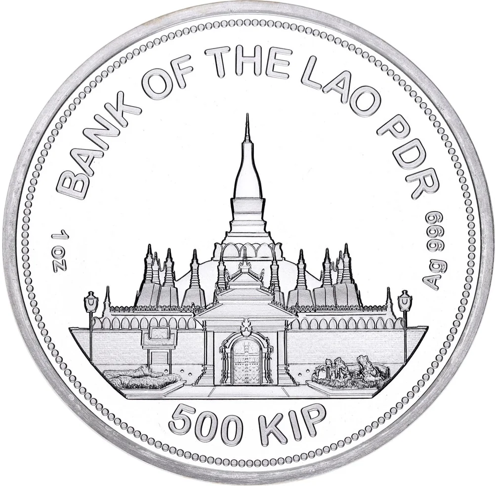 The Bank of the Lao P.D.R. (Vientiane), showing its face value, purity, and weight.
