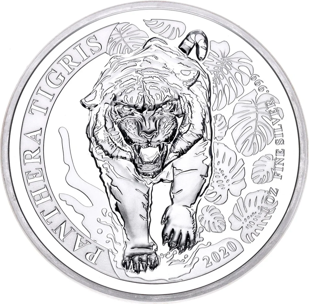 Front view of a tiger emerging from the forest, mouth open in warning, one paw in a puddle amid large leaves. Includes year, purity, and weight.
