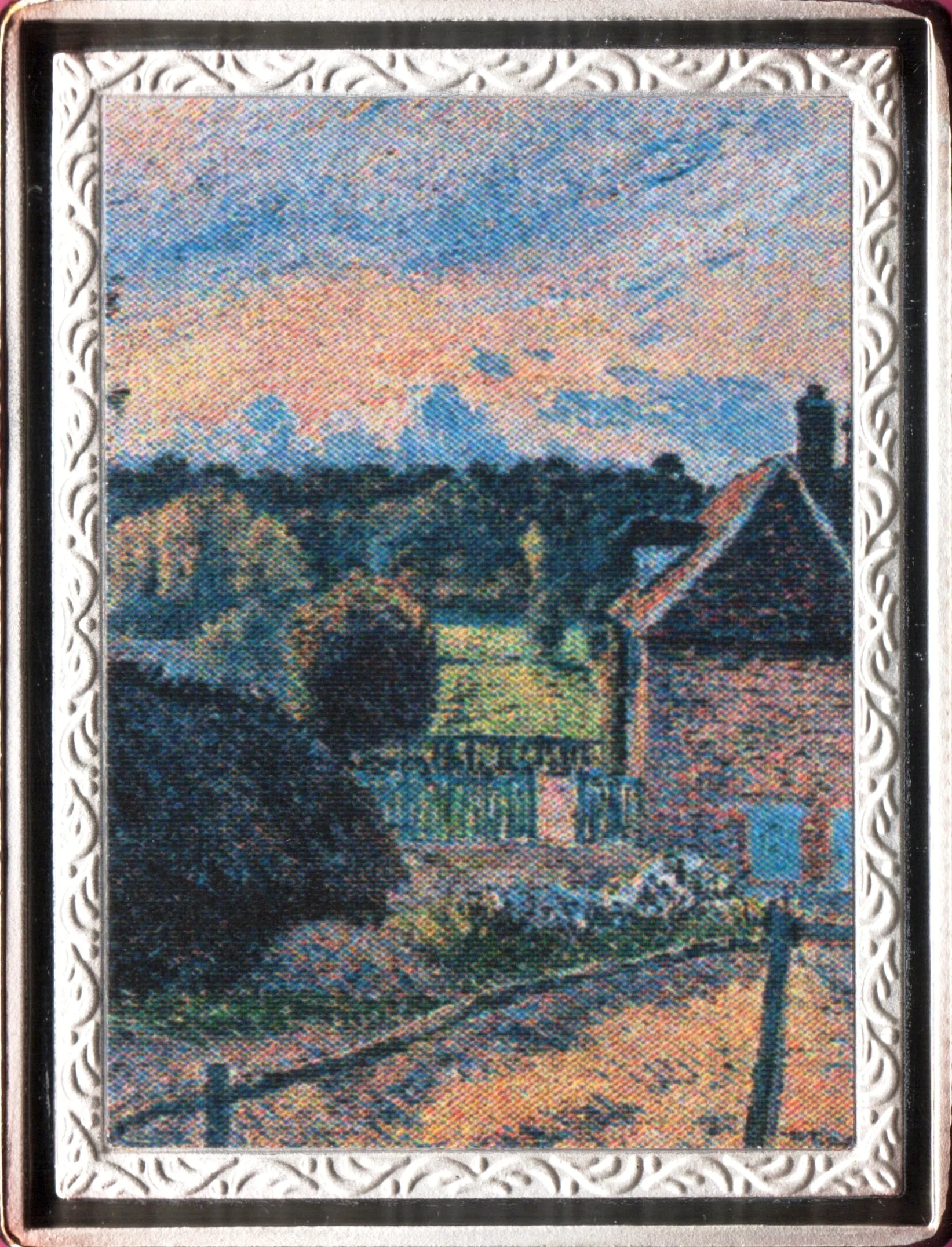 Pissarro's "The House of Folly at Eragny" in a decorated frame.