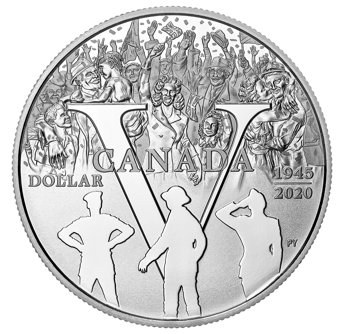 Artist Pandora Young’s reverse design features a selectively gold-plated “V” for Victory. It towers before a jubilant VE-Day crowd from May 8, 1945, which fades into remembrance, represented by three silhouettes of the navy, army, and air force branches in which Canadians and Newfoundlanders served.