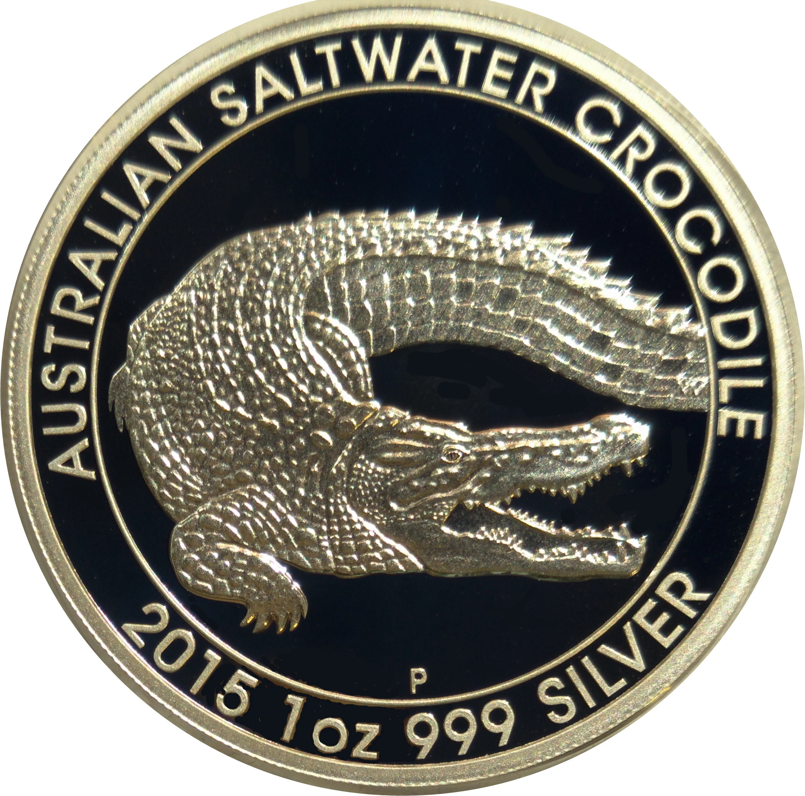 An Australian saltwater crocodile with open jaws, featuring sharp teeth, the year "2015," and the mint mark "P."