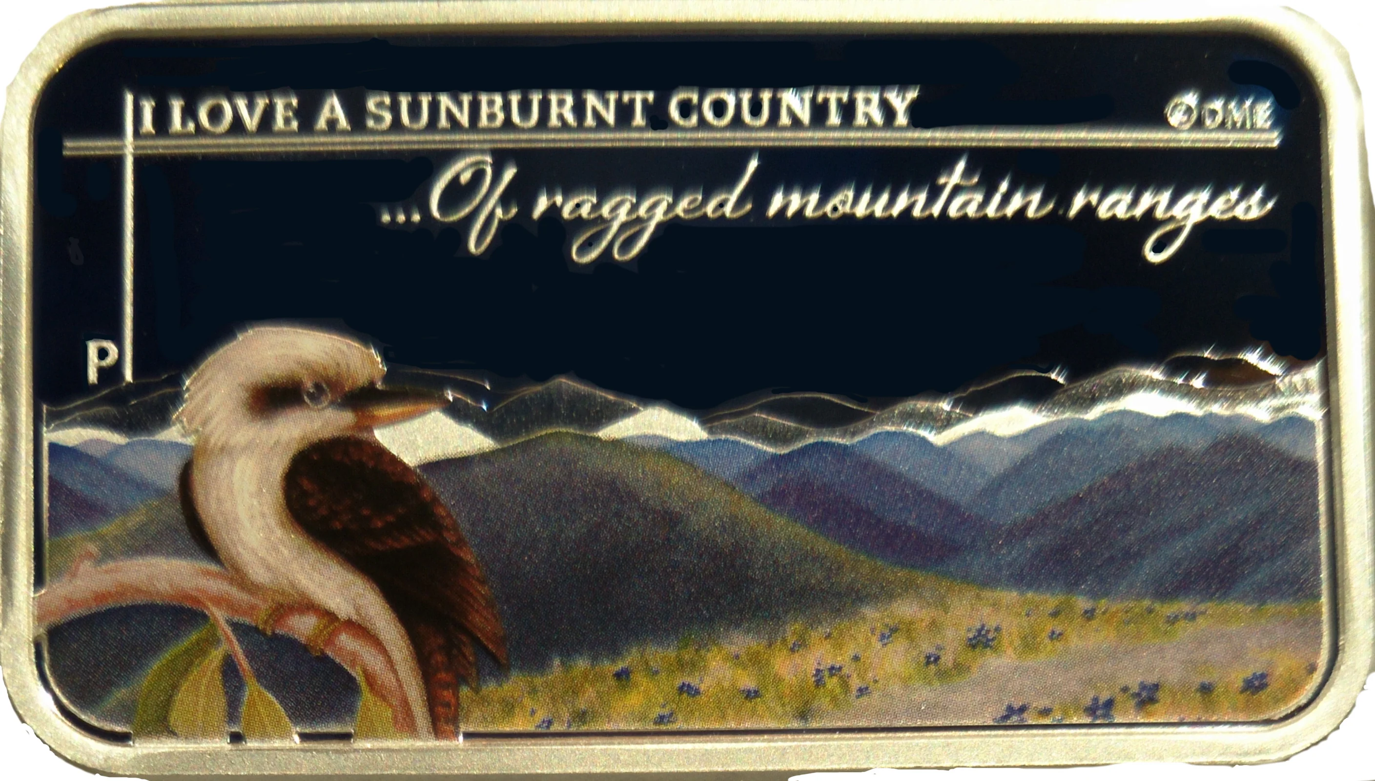 A colorful kookaburra on a eucalyptus branch with mountain ranges, inscribed "I LOVE A SUNBURNT COUNTRY...Of rugged mountain ranges" and the Perth Mint 'P' mark.