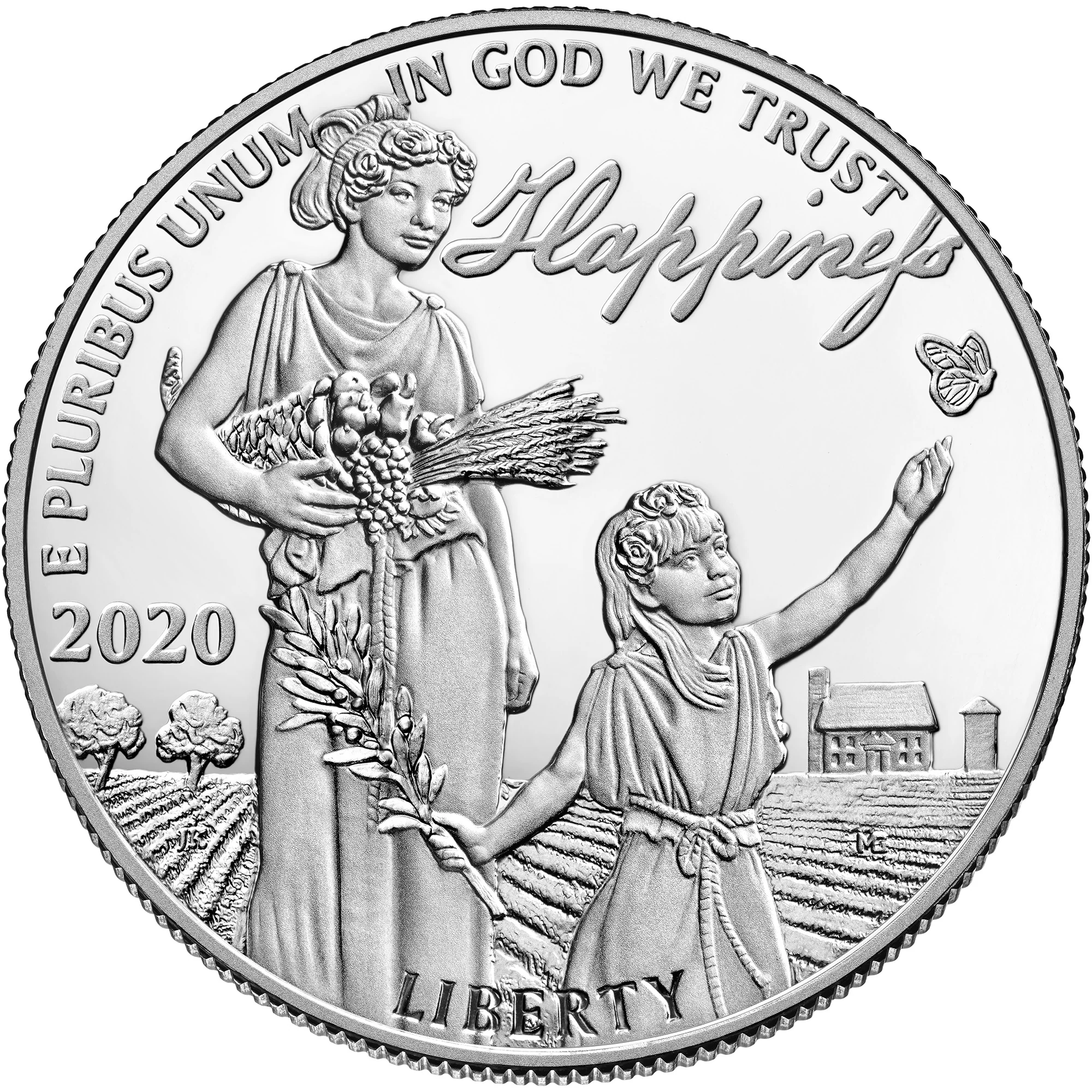 Lady Liberty harvests her labor's fruits beside a playing girl. Her overflowing cornucopia symbolizes the bounty—physical, intellectual, and spiritual—that liberty provides.