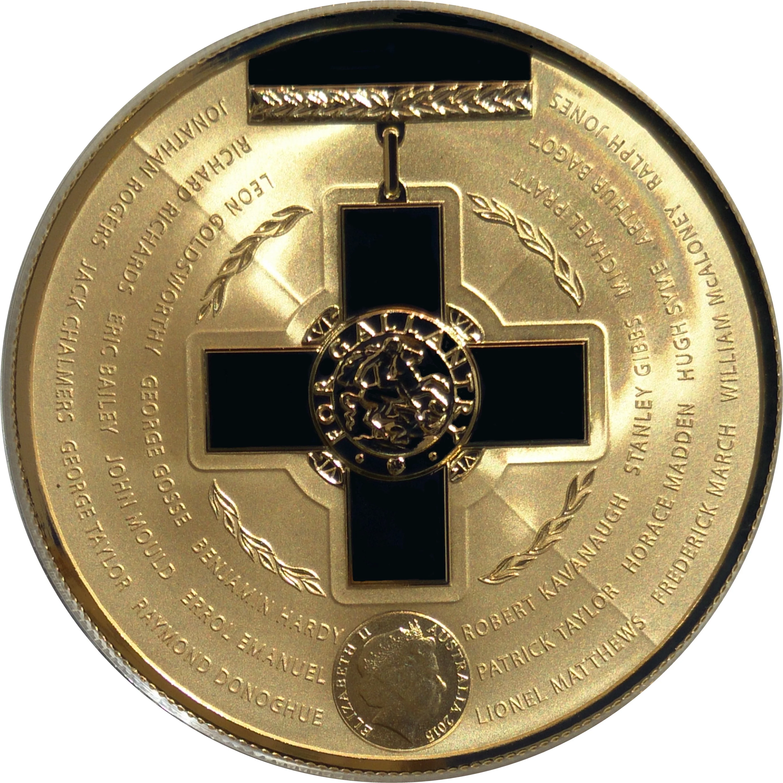 The obverse displays the George Cross, its 22 recipients' names, and a small portrait of Queen Elizabeth II in the Girls of Great Britain and Ireland Tiara.