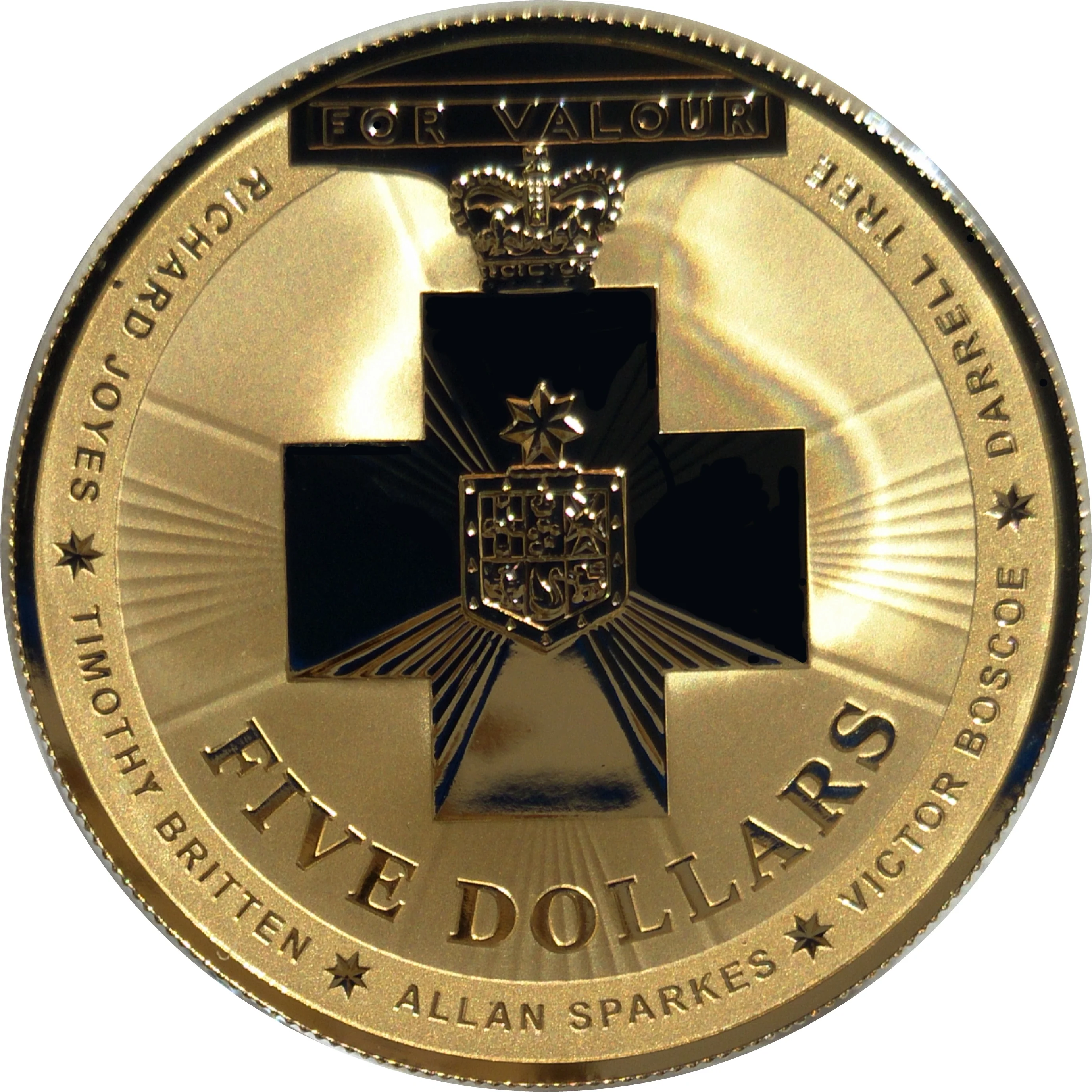 Reverse features the Cross of Valour, its five recipients' names, and the denomination.