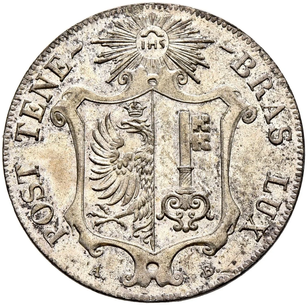 Coat of arms centered, sun above with IHS, flanked by lettering.