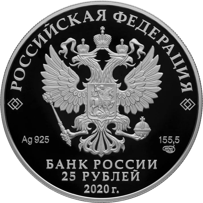 The obverse features the State Coat of Arms of the Russian Federation, along with inscriptions for "РОССИЙСКАЯ ФЕДЕРАЦИЯ," "БАНК РОССИИ," the denomination "25 РУБЛЕЙ," the year "2020," metal specifications, the mint mark, and the precious metal content.