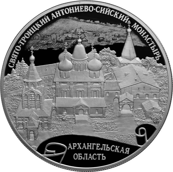 A relief of the Antonievo-Siysky Holy Trinity Monastery. Around the top: ‘СВЯТО-ТРОИЦКИЙ АНТОНИЕВО-СИЙСКИЙ МОНАСТЫРЬ’. At the bottom: ‘АРХАНГЕЛЬСКАЯ ОБЛАСТЬ’ in two lines.