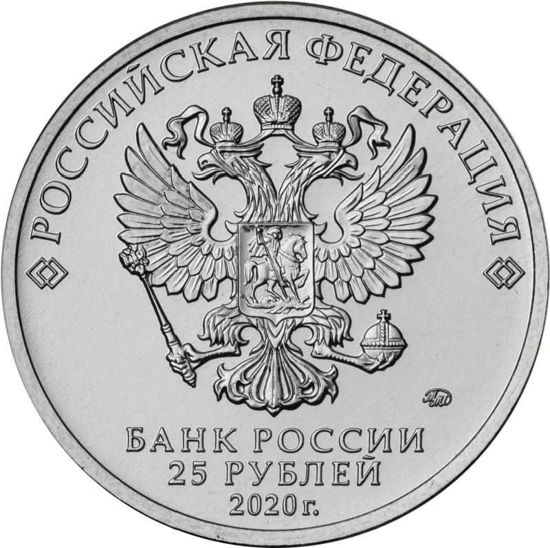 The obverse features the Russian national emblem, with "РОССИЙСКАЯ ФЕДЕРАЦИЯ" above, framed by diamonds. Below are "БАНК РОССИИ", the denomination "25 РУБЛЕЙ", the year "2020 г.", and the Moscow mint mark.