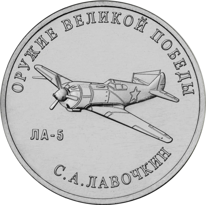 A relief of the La-5 fighter with 'ЛА-5' on the left, encircled by 'ОРУЖИЕ ВЕЛИКОЙ ПОБЕДЫ' above and 'С.А. ЛАВОЧКИН' below.