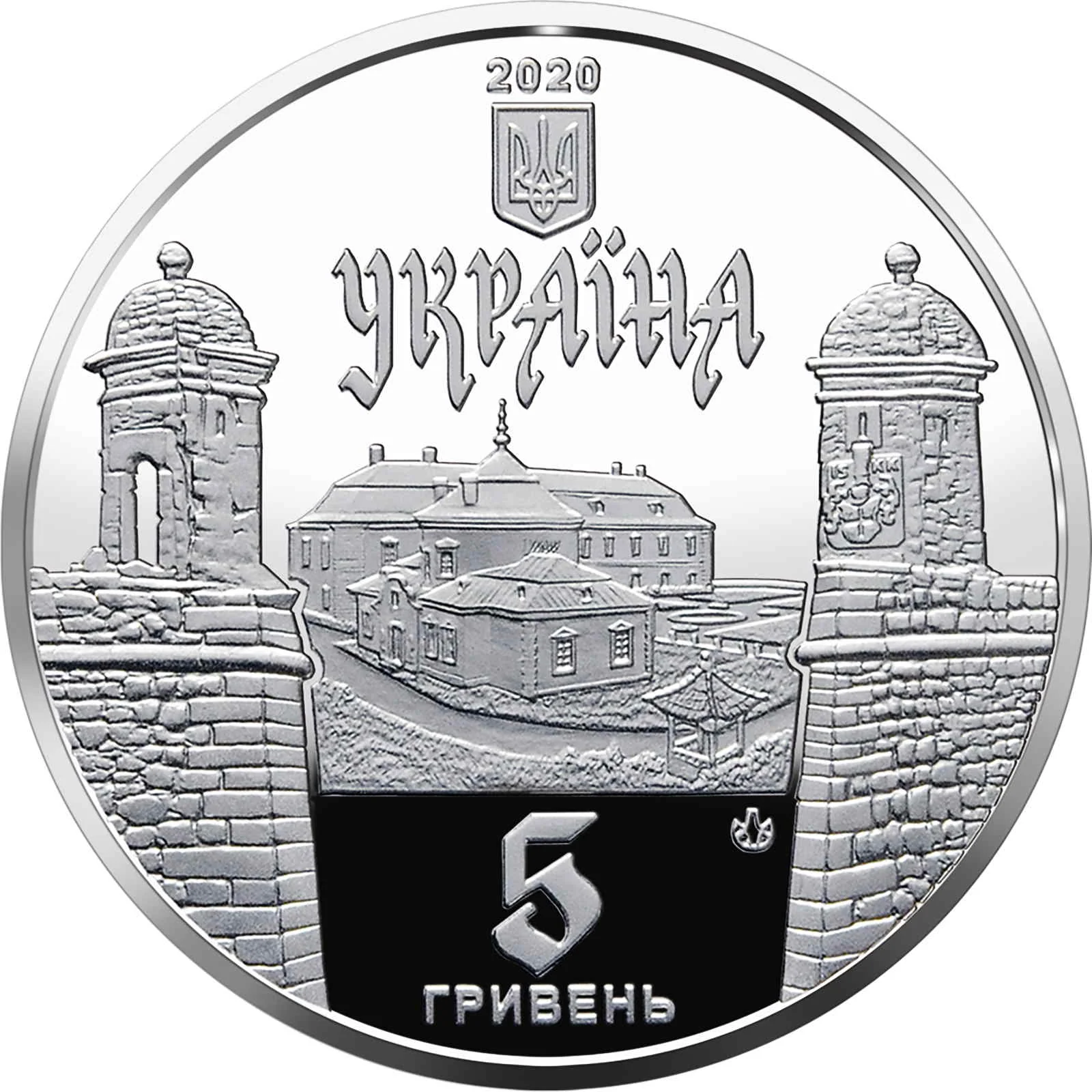 The coin features Ukraine's small coat of arms above the word "УКРАЇНА" and the year 2020. A stylized castle flanked by towers is depicted, with the face value "5 ГРИВЕНЬ" and the mint mark below.